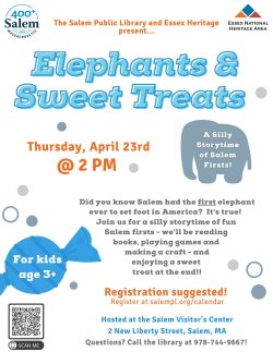 Did you know that Salem had the first elephant to ever set foot in America? It’s true! Join us and the Salem Public Library at the Salem Armory Visitor Center for a story time of Salem firsts – we’ll be reading books, playing games, making a craft, and enjoying a sweet treat at the end. This event is free and geared towards kids ages 3+.